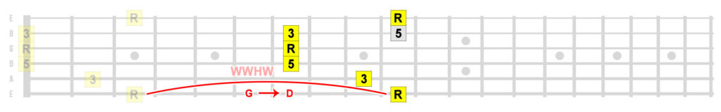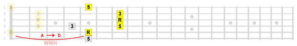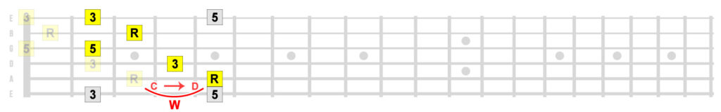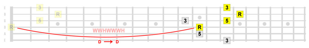 Here, we move from chords to single-note melodies built from the triad tones. Remember those grey notes from the diagrams in Level 1? Both Grey and Yellow notes from the diagrams show you the notes of each CAGED position that belong to the corresponding triad arpeggio (D major).